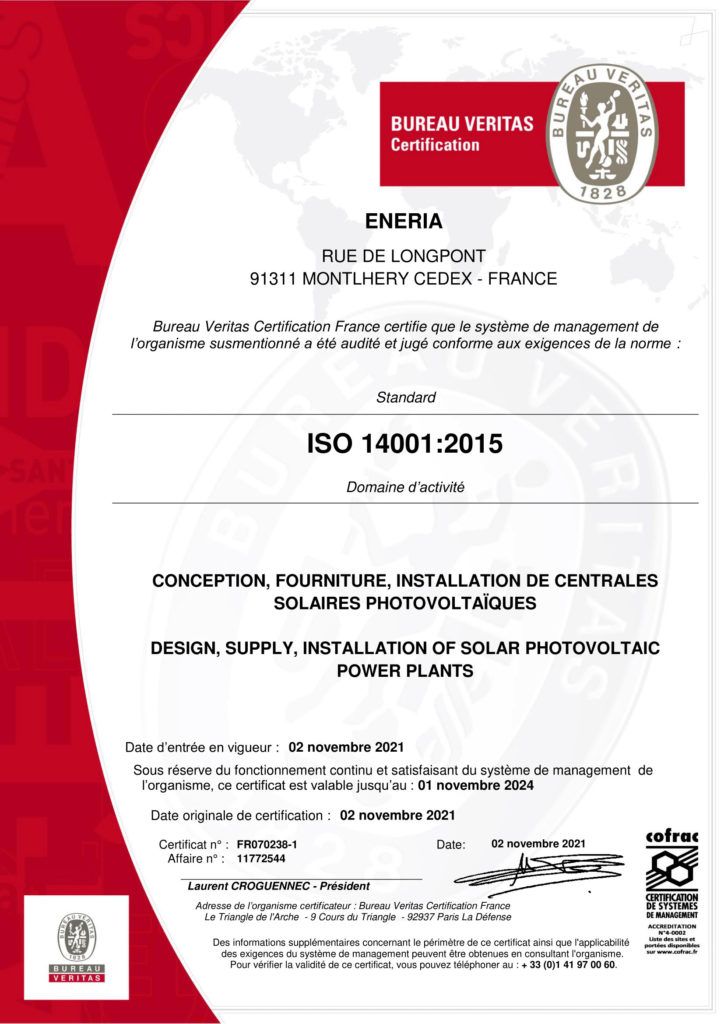 • Certification ISO14001 sur le périmètre ‘’Conception, Fourniture et installation de centrales solaires photovoltaïques’’, qui valide notre organisation, nos process de qualité pour assumer et assurer la bonne exécution des chantiers